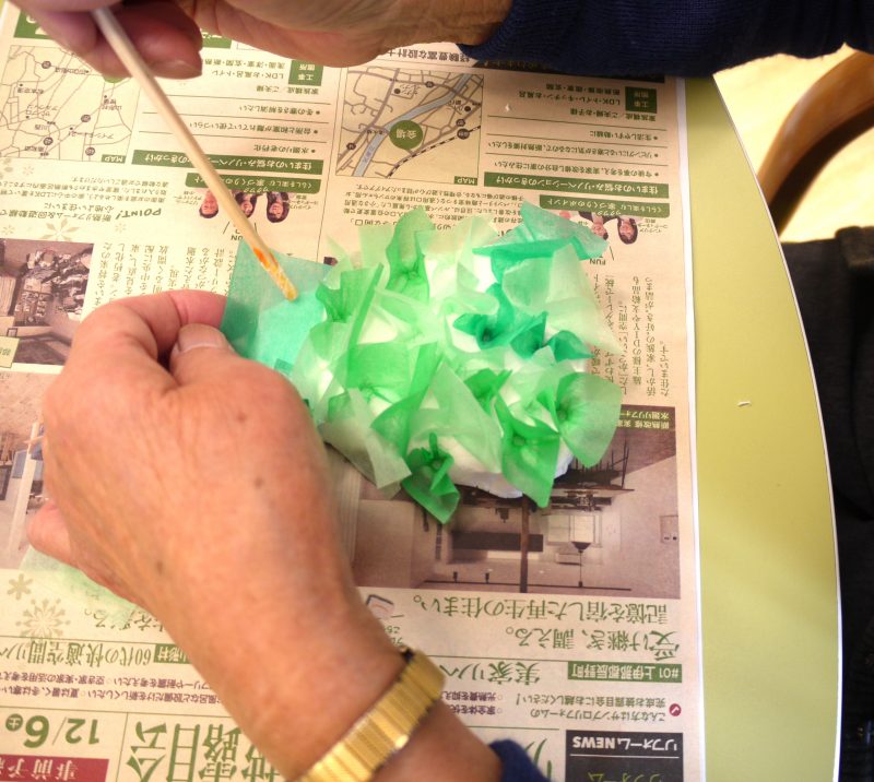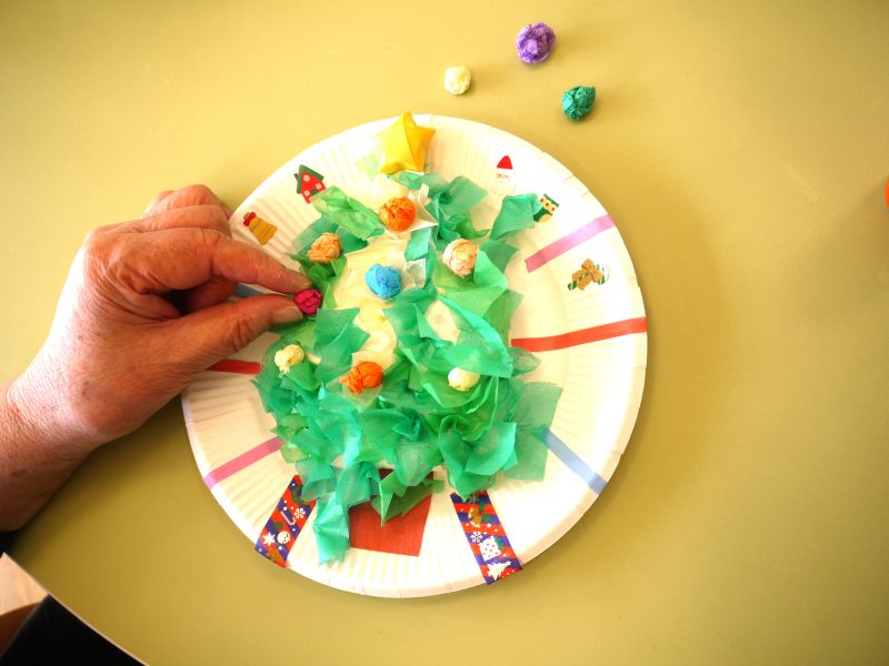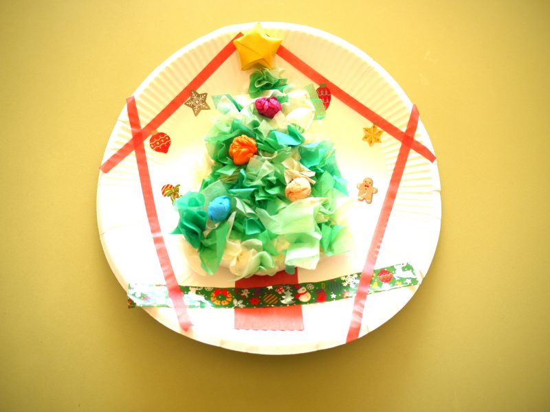 緑の花紙を使ってモミの木を作り、そこに色とりどりの飾りつけをしました!皆さん楽しく飾り付けができました。
