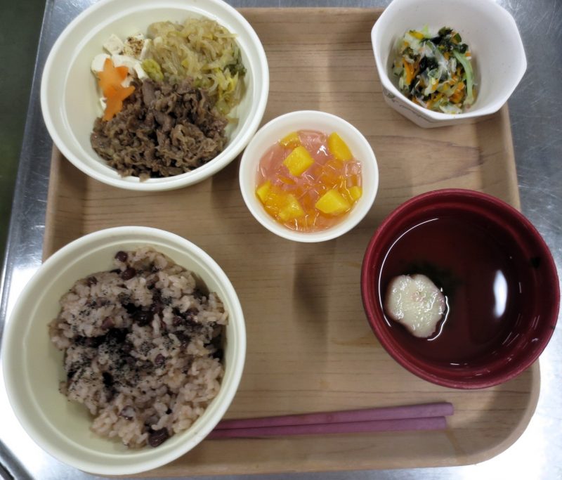 昼食メニューはお赤飯、信州プレミアム牛のすきやき、酢の物、花麩のすまし汁、フルーツゼリーでお祝い膳、