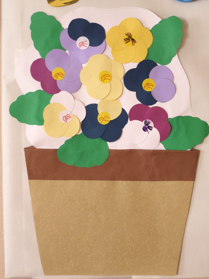 パンジーの花は、画用紙を丸○にカットし、重ねながらのりづけをして、
